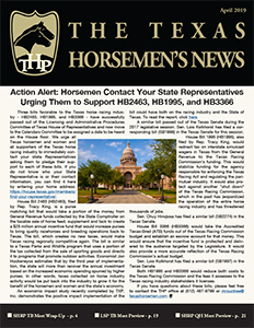 (Austin, Texas - Sunday, April 7, 2019) - On April 7, the April 2019 issue of The Texas Horsemen's News, the official publication of the Texas Horsemen's Partnership (THP), was distributed electronically to the THP's email list. If you are not already on the THP mailing list, be sure to sign up today. Shortly after signing up, you will receive an email with a link showing where you can download your copy of the April issue.